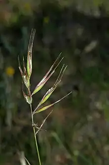 Compound inflorescence (panicle) which is ovate in shape, compact or loose, 2 cm (0.79 in) to 7 cm (2.8 in) long.[2] Inflorescence has 4 to 15 spikelets, which are each flower together with lemma and palea that enclose it.[1] Spikelets green-tinged with purple and are 4–8-flowered, 11 mm (0.43 in) to 18 mm (0.71 in) long.[3] Glumes (bracts at the base of the grass spikelet) subequal, tapering gradually to a point, 11 mm (0.43 in) to 19 mm (0.75 in) long. Lemma rather broad, 3 mm (0.12 in) to 4 mm (0.16 in) long, with 2 rows of hairs, the lower about 1 mm (0.039 in) above the hardened extension from the base of a floret (callus) tuft, and virtually reaching the dense upper ring, the hairs of which normally exceed the twisted part of the central awn. Lateral lobes erect or slightly spreading, 7 mm (0.28 in) to 11 mm (0.43 in) long, abruptly tapering into fine hairs which are about as long as or longer than the flat part. Central awn exceeding lateral lobes by 3 mm (0.12 in) to 8 mm (0.31 in). Palea obovate in shape, the margin with conspicuous hairs, exceeding sinus by about 1 mm (0.039 in). Flowers occur from September to December.