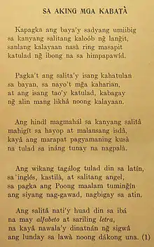 The poem also makes use of the letters 'K' and 'W', whereas during Rizal's childhood, Tagalog spelling was based on Spanish orthography in which neither letter was used. The letters 'C' and 'U' were used instead (i.e., the poem would have been spelled "Sa Aquing Mañga Cabata"). The shift in Tagalog and later Filipino orthography from 'C' to 'K' and 'U' to 'W' were proposed by Rizal himself as an adult, and was later made official in the early 20th century by the Philippine government as per grammarian Lope K. Santos's proposal.[5]