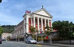 The church was popularly known as "the Basilica", because of its palladian architectural style.[2] It was designated as the cathedral of Wellington in 1984 after earthquake strengthening and the addition of the Blessed Sacrament chapel, foyer, sacristy, courtyard, hall (called Connolly Hall) and piazza. The parish of Thorndon was administered by the Society of Mary (Marist Fathers) for eighty-five years until 1935,[3] although secular or diocesan clergy were also stationed there.[4] The founder of the see, Bishop Viard, and the first two archbishops, Redwood and O'Shea, were also members of the Society of Mary. From 1954 all the archbishops and the resident clergy of the cathedral were secular clergy.[3] However on 4 May 2023 the Marist residency was restored when Archbishop Paul Martin SM succeeded to the see.