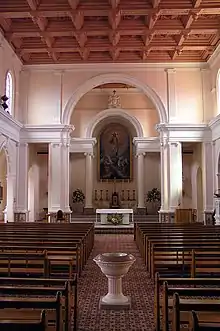 The interior features a main aisle and two side aisles, a large arcaded nave and a large arch forming the entrance to the sanctuary.[24] Walls are built in a succession of arches surmounted by a cornice of stone which forms part of the roof.[25] Series of stone pilasters are ranged against the walls and on the sides of piers. The pilasters in the sanctuary form, with two free-standing columns supporting the cornice, a pleasing assemblage. Their capitals all continue the Ionic theme of the portico. To strengthen the building against earthquakes, concrete piers and steel beams were incorporated in the fabric of the building in 1983. The Blessed Sacrament chapel, the foyer entrance and the adjoining Connolly Hall were added to the cathedral in 1984. They are mainly constructed in concrete.[26] At the same time a large square or piazza was constructed at the east end of the cathedral and this is used for processions and gathering space, especially on Palm Sunday, during Holy Week, and at Easter for the Service of the light and the candle-lit procession before the Easter Vigil Mass. For a period Sacred Heart looked even more palladian when it had twin bell towers topped with domes.[27] These towers (not designed by Francis Petre[28]) were incorporated in the original design but were removed in 1942, following an earthquake.[3]