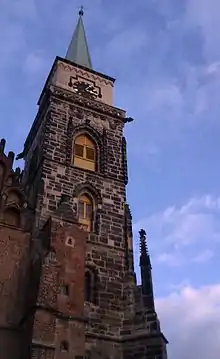 The northern tower is no longer there except of its remains under the level of the crowning cornice. During the direction of Kamil Hilbert was moved the vault from the southern porch of the presbytery into the first floor of the northern tower. The southern tower has four levels separated by stone mouldings. The tower has two buttresses, buttresses are finished with pinnacles and the Gothic rose at the top. Pinnacles are also at corners of the second and the third floor. In the ground floor is one narrow twin lancet widow. In the first and the second floor are four large pointed windows. Above the third floor was added a cube of the fourth floor in the 20th century. On the forth floor is a room for guardian and four clocks. Around the fourth floor runs a gallery with a stone balustrade. There is only one preserved gargoyle, four others are new. Original is also a belt of tetra-foils under the balustrade and five coats of arms lower.