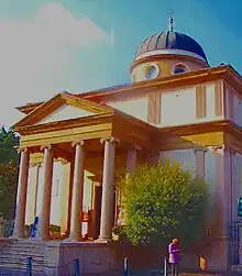 Unlike the original building, after its relocation and reconstruction the church's exterior was decorated. Since the little church was to be used as a noble family's place of worship rather than a Franciscan chapel, Albertolli decided to enhance the exterior with Neoclassical features to compensate for its plain appearance.[16] The building, with a quadrangular layout, stands on a high base, a wide stairway leading up to the Neoclassical tetrastyle entrance; on the opposite (north) side, there is a sacristy. These additions were needed to compensate for the absence of the original complex to which the chapel was attached.[17] The facade is marked by ionic pillars that support the triangular tympanum on a cornice bearing an attic; furthermore, the chapel is crowned by a circular tambour and a hemispherical dome.[18]