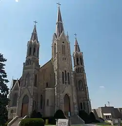 The first church building for Saints Peter and Paul parish was constructed of limestone in 1868. The present church was completed in 1906. It was constructed in cut-stone, quarried in Stone City, Iowa, in the Late Gothic Revival style. It was designed by Dubuque architect Martin Heer. The church was commissioned during the pastorate of the Rev. William B. Sassen in 1903. The foundation was laid by M.J. Mersch, and Dubuque contractor F.D. Schnak was responsible for the superstructure. The altars and the confessionals were created by the Hackner Altar Company of La Crosse, Wisconsin. The interior frescos were the work of Joseph Walters of Dubuque. The stained glass windows were designed and manufactured under the direction of Victor von der Frost in Munster, Germany. The church was completed for $85,000.[2] The pipe organ in the rear gallery was built by the Tellers Organ Company of Erie, Pennsylvania, in 1939. In addition to the church, the rectory (1917) and an Art Deco school building are located on the parish grounds.
