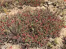 It grows as an erect or decumbent perennial herb with succulent, stem-like leaves, growing up to 0.8 m in height.[2] It is very similar to the better known beaded glasswort but is a larger plant and differs in having a thicker fruiting spike, 4โ9 mm in diameter, and seeds with blunt hairs or papillae.[3]