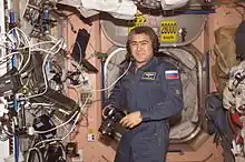 Salizhan Shakirovich Sharipov (Russian: Салижан Шакирович Шарипов, Uzbek: Солижон Шокирович Шарипов, Kyrgyz: Салижан Шакир уулу Шарипов, Tajik: Солиҷон Шокирович Шарипов; born 24 August 1964) is a Kyrgyz cosmonaut of Uzbek descent.[1] Sharipov is a co-author and investigator for the Advanced Diagnostic Ultrasound in Microgravity project. He has been to space twice (launched from the U.S. as an astronaut in 1998 and from Russia as a cosmonaut in 2004) and has conducted two space walks. Sharipov retired on 18 July 2008.[2]