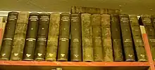 Volumes from the second edition of Salmonsens Konversationsleksikon (1915–1930). Volumes of the second edition often display an uneven appearance due to an inferior quality of leather used during World War I.