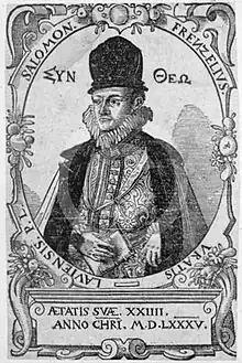 Frenzel (Frencelius) was born in Breslau (Wrocław). His date of birth is variously given as 1560, 1561 or 1564.[1] His father, also Salomon Frenzel, was a Protestant pastor.[1][2] The younger Frenzel studied at the universities of Wittenberg and Strasbourg.[2] He was laureated for his poetry in March 1584 by the Count Palatine Hartmann Hartmanni, seemingly at Strasbourg.[1] In 1589, he was ennobled by the Emperor Rudolf II. He spent the next five years in the imperial capital of Prague. In 1594, he took up a chair in ethics at the University of Helmstedt. In 1599, he was named rector of the cathedral school of Riga.[1][2] He died in Riga within a year.[3]