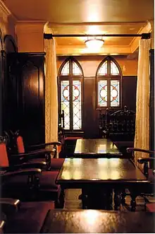 After his release from Yamashina Prison, Tateno decided to remodel the Salon de thé François. Tateno asked an Italian friend, Alexsandro Bencivenni, to design a new interior. Bencivenni was an academic at Kyoto Imperial University who had escaped from fascist Italy. In these days, Fosco Maraini, an Italian ethnologist, also resided at Kyoto Imperial University for the same reason. While Bencivenni worked on the master plan, Shirō Takagi, another friend of Tateno, designed stained glass windows and painted several murals. The interior hall of 40 square meters was arched with a dome 4.5 meters high, which emulated a public room of an ocean liner sailing between Europe and Asia. The decorative motif represented the Italian Baroque style of the 17th century although several columns were designed to represent the style of the Italian Renaissance.