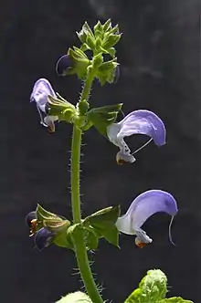 Salvia algeriensis is an annual Salvia native to northeast Morocco and northwest Algeria, found growing at up to 600 m (2,000 ft) elevation. In its native habitat, it grows nearly 1 m (3.3 ft) in height (it is much shorter in cultivation), with bright green ovate leaves about 8 cm (3.1 in) long and wide. Each plant produces 3-4 inflorescences up to 15 cm (5.9 in) long, with light violet flowers that have violet specks on the lower lip. The plant has a light scent when crushed, similar to thyme.[1]