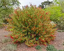 The large flowers grow up to 1.5 in (3.8 cm) long, and are a vivid orange-red, held in a 1.5 in (3.8 cm) yellow-green calyx tinged with purple glands. They grow abundantly in tightly spaced whorls on 8–12 in (20–30 cm) long inflorescences. It blooms in late winter and early spring, with hard annual pruning (down to leaf nodes near the ground) recommended after blooming. The plant will grow back to 6 ft (1.8 m) in one season.[1]