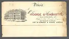 The Samuel F. Hodge & Co. was a manufacturer of marine engines in Detroit. Originally established in 1863 under the name of Cowie, Hodge & Co. In 1865, the firm became Hodge & Christie. In 1870, Mr. Hodge bought the interest of Mr. Christie and continued the business individually. In 1876, during the worst of the depression following the crash of 1873, Samuel F. Hodge built one of the most convenient manufacturing establishments in Detroit, S.F. Hodge & Company, equipping it with a plant second to none. In 1883 it was incorporated as the Samuel F. Hodge & Company. Samuel F. Hodge retained the presidency until his death.[1] They turned out 125 engines between 1884 and 1899. They built the first triple expansion engine to be used on the Great Lakes. It was placed in the Roumania on October 2, 1886.[2] Here also was built the engine for Capt. Hoyt, the first of Capt. Alexander Mc Dougall's whaleback steamers built at West Superior. The engine in the whaleback steamer, Westmore, which attracted much attention in Liverpool when she crossed the Atlantic, was a product of these shops. The great whaleback excursion steamer Christopher Columbus, employed at the World's Fair, received her engine from Samuel F. Hodge & Co. This was said to be the largest single engine of its class on the lakes. Samuel F. Hodge & Co. was located at 308 to 326 Atwater St. East, in Detroit.[3]