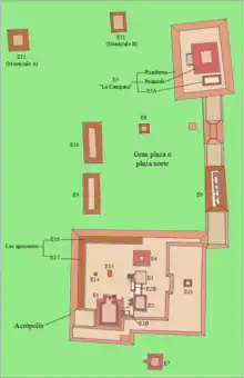 The residential area has not yet been well studied. The investigations and excavations in San Andrés have been primarily of the political-ceremonial center and have revealed that it was divided into the South Seat (from which they governed) and the North Seat. In the year 600, the South Seat was filled with adobe (leaving a tunnel leading to the original seat) to construct the Acropolis, which contains ceremonial and political structures. In the ends to the South and East of the Acropolis are pyramids or structures: 1 (the main pyramid), 2, 3 and 4. In the North ends and the west are a series of rooms where the governors lived (the last palaces of San Andrés) of which two have been reconstructed. To the south of the Acropolis lies structure 7, another ceremonial structure. In the North seat, or Great Seat, is the pyramid or structure 5 (called "La Campana" - the bell) which is united with the Acropolis behind structure 6 (which has the shape of an L). Around structure 5 are the structures where commerce took place.