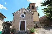 The parish church adjoins Castle of Montesperello, outside the castle walls and having an external bell tower.