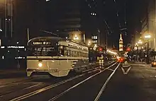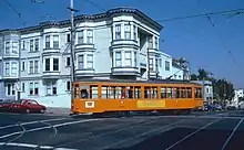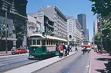 The San Francisco Historic Trolley Festival was a heritage streetcar service along Market Street in downtown San Francisco, California, that used a variety of vintage streetcars and operated five to seven days a week, primarily in the summer months, between 1983 and 1987.[3] Operated by the San Francisco Municipal Railway (Muni), the city's primary transit agency, and co-sponsored by the city's Chamber of Commerce and various corporate and private donors, it was the predecessor of the F Market & Wharves streetcar line that opened in 1995.[4] It used historic streetcars/trolleys  these two terms are synonyms in most parts of the United States[5]  from several different countries, as well as a number of preserved San Francisco streetcars, many of which were borrowed from museums. The impetus behind the Trolley Festival was that the city's famous cable car system, one of its biggest tourist attractions, was due to be closed for 20 months (this ended up stretching to 21 months)[6] starting in September 1982 for a needed rebuilding of its aging infrastructure. Local business owners and city officials were very concerned that the temporary absence of the cable cars would lead to a sharp decline in tourism,[7][8] especially during the one summer season included in the 20-month period.