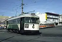 Rick Laubscher, who then chaired the Chamber's transportation committee, organized the event in collaboration with Mayor Feinstein.[4] A roster of vintage streetcars still needed to be assembled and a route chosen. For the vehicles, Muni's car 1 would be joined by Muni car 130 (built in 1930 by Jewett Car Company), which was nearing completion of a restoration from its last configuration as work car 0131, and car 178 would be borrowed again from the California Railway Museum (Western Railway Museum).[7] Several railway and streetcar museums across the country were contacted and asked whether they would loan a streetcar for the event.[14] Most declined, but the Oregon Electric Railway Museum agreed to loan its Portland car 503 (a 1903 Brill), and the Western Railway Museum would loan Blackpool, England, "boat tram" 226 in addition to its San Francisco car 178. The Oregon museum's Paul Class, who had become well known to streetcar fans through his streetcar importing business, Gales Creek Enterprises, arranged the lease to San Francisco of two single-truck streetcars from Porto, Portugal, Nos. 122 and 189.[26] Maurice Klebolt arranged for a W2-class streetcar to be brought from Melbourne, Australia.[27] The planned fleet was becoming increasingly international, a development enthusiastically supported by Klebolt, who had acquired a 1954 streetcar from Hamburg, Germany, in 1979 and donated it to the city of San Francisco in hopes that it would one day operate on the city's transit system.[28] (Trolley Festivals in subsequent years saw the addition of trolleys from Japan, Italy, Mexico and Russia.)[3]