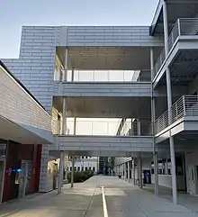 The center includes a fine arts gallery and a theatre/performance space, alongside classrooms for relevant departments.