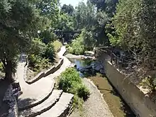 San Luis Obispo Creek begins in the Santa Lucia Mountains, at Cuesta Pass in the Los Padres National Forest.[3] It flows south down a steep canyon below the Cuesta Grade of U.S. Highway 101 and turns to the west after receiving Reservoir Canyon Creek from the left.[3] Entering the city of San Luis Obispo it turns southwest, flowing through residential areas and past San Luis Obispo High School. The creek flows in a man-made channel as it approaches downtown west of Johnson Street. At Osos Street it enters a concrete tunnel about 1,000 feet (300 m) long passing beneath downtown San Luis Obispo. After emerging from the tunnel it flows past Mission San Luis Obispo de Tolosa, and then receives Stenner Creek from the right just upstream of Marsh Street.[3]
