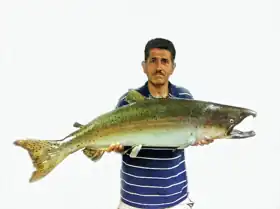 Leidy (2007) identified the native fishes in San Tomas Aquino Creek as Hitch (Lavinia exilicauda), California roach (Lavinia symmetricus), Sacramento sucker (Catostomus occidentalis occidentalis), Three-spined stickleback (Gasterosteus aculeatus), rainbow trout (Oncohrynchus mykiss irideus) and possibly Chinook salmon (Oncorhynchus tshawytscha). Although the latter had been considered now absent from the watershed, in mid-October, 1996, Roger Castillo, the founder of the Salmon and Steelhead Restoration Group, recovered a giant Chinook salmon from San Tomas Aquino Creek beneath Highway 237 (see photo). Non-native fishes include Common carp (Cyprinus carpio), Goldfish (Carassius auratus auratus), Golden shiner (Notemigonus crysoleucas), and Western mosquitofish (Gambusia affinis).[19]