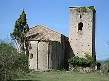 The main element of the monastery is its church, which consists of a wide nave roofed with a barrel vault and terminated by a slightly narrower apse. The apse is also covered by a semicircular vault, and is decorated. There are blind arcades in groups of four between semicircular columns reinforced by brackets.