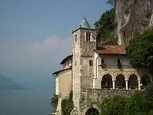 Hermitage of Santa Caterina del Sasso (Italian: Eremo di Santa Caterina del Sasso) is a Roman Catholic monastery located in the municipality of Leggiuno, in the Province of Varese and the region of Lombardy, Italy. It is perched on a rocky ridge on the eastern shore 16m above Lake Maggiore.