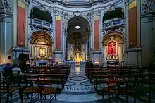 Under Pope Clement XII, the architect Carlo de Dominicis created the current baroque church which was completed in 1735.[11] The main altarpiece is a Christ in Glory by Pompeo Batoni and commissioned by Cardinal Giuseppe Furietti.[8] This present building has been described as "...one of the loveliest Baroque interiors in the city [of Rome]"[12] and "a fine example of eighteenth-century art".[12]
