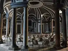 The church has always been associated, in one form or another, with an orphanage. The complex of buildings attached to the church are now part of a maternity and pediatric hospital. As an orphanage, it was equipped with a famous wheeled system on the wall, where abandoned infants were placed into a revolving basket container from the street, and the basket could then be turned such that the infant wound up within the church where nuns would then receive, baptize, and register the new addition to the orphanage. (The "basket room" has been restored and visitors may see how the operation was handled.) The existence of the wheel is documented by 1601. The system was abolished in the 1870s. The church functioned as an orphanage until the 1950s at which time state social services took over the task.