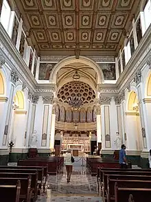 Documents point to a church at the site since 1178. Further refurbishments followed over the centuries; however, the church was razed by an earthquake in 1857. Few traces of the previous church remain; it appears that although the reconstructed building, begun in 1872, has just a single nave, the earlier structure had three. The interior decoration of the church was done mainly in the 1930s, with frescoes by Mario Prayer.[2]