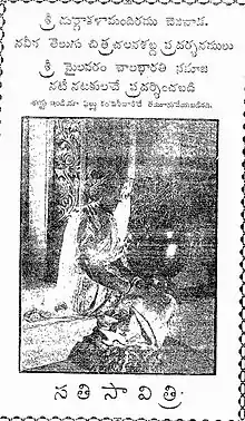 Sati Savitri is a 1933 Indian telugu language mythological film directed by C. Pullayya. It was based on a popular stage play of Mylavaram Bala Bharati Samajam. It was the first film produced by East India Film Company with an estimated budget of ₹75,000 in Calcutta.[1] The blockbuster film has received an honorary diploma at the 2nd Venice International Film Festival.[2] The story is about Savitri and Satyavan from Mahabharata. According to the legend, Princess Savitri (Dasari Ramathilakam) marries Prince Satyavan despite a curse that foretells his death within a year. She manages to get Yama (Vemuri Gaggayya), the God of death, to restore her husband to life.[1]