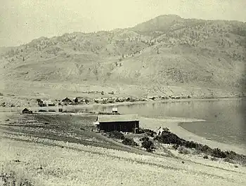 For thousands of years, First Nations used trails and waterways to travel between hunting, fishing and trading areas.[2] Prior to the 1860s, French was probably more common in parts of the interior than English. Consequently, Boute du Lac[3] (meaning foot of the lake) Indians was the name initially assigned to this indigenous group.[4] Since the Hudson's Bay Brigade Trail crossed the Thompson at Kamloops, these people would have experienced limited exposure to the French-speaking fur trade era.[5]