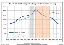Development of Population since 1875 within the Current Boundaries (Blue Line: Population; Dotted Line: Comparison to Population Development of Brandenburg state; Grey Background: Time of Nazi rule; Red Background: Time of Communist rule)