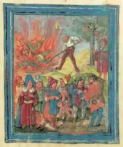 Burning of the Jews because of the alleged ritual murder of Konrad Lori from Diessenhofen, as depicted in Diebold Schilling the Younger's Luzerner Schilling[1]