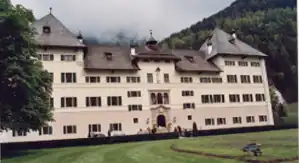 Already in the Middle Ages, there was a hunting seat of the Salzburg Archbishops in the Blühnbach Valley.[2] During the German Peasants' War of 1525/1526, the manor house was destroyed.[2] However, it was soon restored afterwards.[2] It was a modest building, primarily constructed from wood.[2] Prince-Archbishop Wolf Dietrich von Raitenau (1559-1617) created a hunting lodge in stone between 1603 and 1608.[2] The name of the architect is not known, but an attribution to the Italian Vincenzo Scamozzi from Vicenza could be defended, as he was working in Salzburg at the same time.[3] Although some state that this is just speculation.[4] Master builders involved were Ruep Eder, Andrä Mairer and Gabriël Prändtl.[2] In 1604, a newly fitted roof collapsed under the snow load of the harsh winter and had to be renewed the next year. With the finalization of the stables, the castle was completed in 1608.[2] However, the planned magnificent interior decoration was largely omitted, as Wolf Dietrich was disposed and his successor Prince-Archbishop Markus Sittich von Hohenems (1574-1619) was not fond of hunting.[3] Instead, he preferred the pleasure gardens of Hellbrunn Palace.[3]