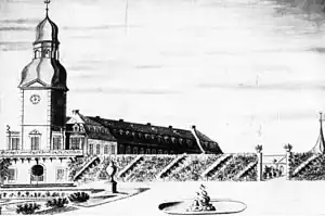 In 1720, Josep Charles (1694-1729), hereditary prince of Sulzbach constructed a summer palace in Oggersheim.[1][2][3] In 1729, a baroque Loreto chapel was added in the palace gardens.[3] When prince Joseph Charles passed away in 1729, the palace was not used for 22 years until 1752, when Count palatine Frederick Michael of Zweibrücken-Birkenfeld (1724-1767) turned Oggersheim into his summer residence.[1][2] With help of the architect Nicolas de Pigage (1723-1796), he fully reconstructed the palace between 1752 and 1757.[1][2] In addition, a large baroque garden in French style was created, including various pavilions, bath houses as well as a large orangery.[1][2][3]