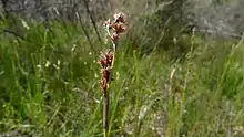 Schoenus villosus, known as the hairy bog-rush, is a species of sedge native to Australia. A tufted perennial grass-like plant growing from 15 to 40 cm tall. The stem is grooved, 1.2 to 1.7 mm wide. Found near the coast or nearby ranges in Queensland and New South Wales. Growing in heath or woodland, on sandy soils. The specific epithet villosus is derived from Latin, meaning "hairy". One of the many plants first published by Robert Brown with the type known as "(J.) v.v." Appearing in his Prodromus Florae Novae Hollandiae et Insulae Van Diemen in 1810.[1][2]