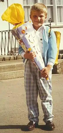 When children in Germany and in parts of the Czech Republic close to the German border,[1] in parts of Poland (Greater Poland, Upper Silesia, Warmia), in Austria, in the German-speaking parts of Switzerland and Belgium set off for their first day of school upon entering first grade, their parents and/or grandparents present them with this large cone, attractively decorated and filled with toys, chocolate, candies/sweets, school supplies, and various other special treats. The cone is given to children to make this anxiously awaited first day of school a little sweeter.