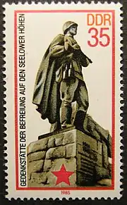A DDR stamp showing the Soviet memorial statue at the Seelow Heights.