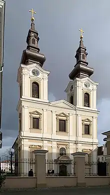 In 1737 (according to other sources 1728), during the plague epidemic in the city, the Serbian Orthodox Cathedral that originally stood on this site burned down.[2] The present church was built in Baroque style between 1744 and 1748 by order of the Serbian Orthodox Bishop Georgije Popović.[3] The church was built from the donations of the churchgoers, being made of stone and brick.[2] In order to gain space for the larger church, a Turkish rampart that had existed since the 16th century was demolished in 1742. In 1791, when the church was restored under Bishop Petar Petrović, it was completed with two towers, in which there are five bells, one of which weighs 800 kg.[4]