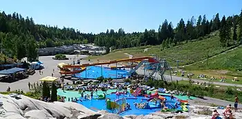 The water park features a variety of water slides, patios and hot tubs, children's pools and sparkling rapids, and the sauna departments are located in a part of the water park excavated inside the rock.[1] There are also restaurants and cafés in the area.[7] The Serena Ski Center is open in winter.[1] There are six cottages for rent all year round.[1][7]