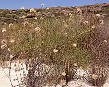 Fire destroys the plant but the seeds survive. Two months after flowering, the fruit falls off and ants disperse the seeds. They store the seeds in their nests. The plant is unisexual and pollination takes place through the action of insects. The plant grows in sandstone soil at elevations of 700-800 m.
