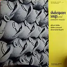 Shakespeare Songs is a 1967 LP album of Elizabethan songs which is one of the most celebrated recordings of the countertenor Alfred Deller.[1][2][3][4] Deller is accompanied by lutenist Desmond Dupré and the Deller Consort, Philip Todd and Max Worthley tenors, Maurice Bevan baritone.[5]