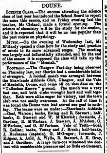 In the former, the club gained walkovers against both Clydesdale and Possil Bluebell to reach the third round, where the club was drawn to visit Clyde. As the Thursday before the third round tie was Glasgow fast-day, the club visited the Vale of Teith club in Doune for a warm-up match, losing 1–0.[4] Two days later the Athletic lost 4–0 at Clyde in a "very pleasant" game, Sloan scoring a hat-trick.[5][6]