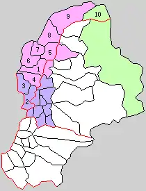 * yellow - areas formerly within the district borders during the early Meiji period