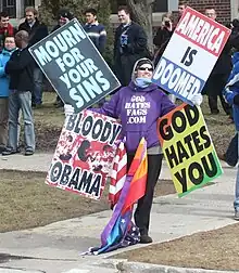 Besides her father Fred, Shirley Phelps-Roper was the most active spokesperson of the Westboro Baptist Church and answered many of the e-mails sent to the church in a column called "Dear Shirley".[8] She and other family members have become known for picketing at funerals of AIDS victims with signs such as "God hates fags" and at funeral processions for American soldiers killed in combat.[9][10]