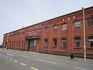 Shore Road Goods was a goods terminus in Birkenhead, England. The goods station was situated near to Morpeth Dock, on the Birkenhead Dock Branch railway line, and operated by the Cheshire Lines Committee.[1] The CLC was granted permission to run two locomotives on the dock lines from 13 March 1884.[2] The engine shed, which adjoined the goods station, was opened in 1888 and closed in 1961.[3] The main building of the goods station is still in existence, and is used as an office for Wirral Metropolitan Borough Council's archives service.[4][5]