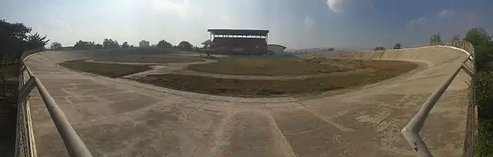 The 333.33 m or 1,093.6 ft velodrome is outdoor and the surface is made of concrete. While it was a prime venue for the 3rd Nationals Games in the year 1993–94 it has never been a place for any major events thereafter, and was left unused. In 2014 it was announced that with a Rs 10 crore maintenance grant from the governments for the entire complex, the facelift of the velodrome had top priority. At that time the velodrome was in dilapidated state.[15]
