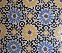 The patio is distinguished by a paving in white marble encrusted with black marble; it is framed by porticos which each have five broken oversized arches made of stone paired with ocher shellstone.[3] The arches rest on columns of white marble whose capitals are Hafsid or Hispano-Moorish.[4] The hypostyle-type prayer room is divided into three naves parallel to the wall of the qibla.[1][3] The whole building, including the zaouia and its outbuildings, covers a total area of almost 2,700 square metres (29,000 sq ft).[1]
