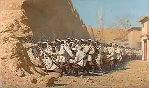 The siege of Samarkand was a military engagement fought in Samarkand, Uzbekistan in 1868 between the Russian Empire and a combined army of forces from the Bokharan Emirate, and several Uzbek tribes.[2] During the engagement, a Russian garrison successfully repelled multiple attempts by the besieging allied army to storm the city. The Russian victory solidified imperial control over the new state of Russian Turkestan, and caused the partial collapse of the Bukharan Emirate.