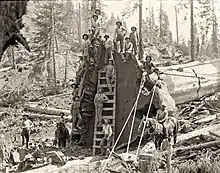 In the late 1800s, the logging industry moved westward due to the depletion of white pine forests in the upper Midwest.[68]:9–14 This shift was encouraged by the positive portrayal of the Sierra Nevada as a promising timber region. In 1859, Horace Greely marveled, "I never saw anything so much like good timber in the course of any seventy-five miles' travel as I saw in crossing the Sierra Nevada."[69]