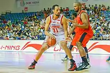 Kyle Jeffers (in white) takes on Chris Ellis of the Indonesia Warriors in an ABL match on 10 August 2014.