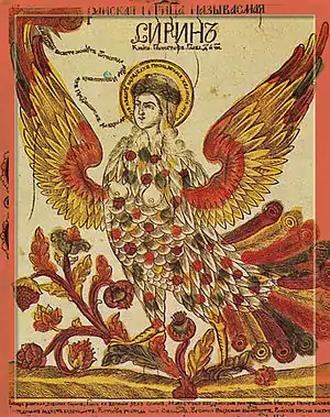 Sirin is a mythological creature of Rus' legends, with the head of a beautiful woman and the body of a bird (usually an owl), borrowed from the siren of the Greek mythology. According to myth, the Sirin lived in Iriy or around the Euphrates River.[1][2]